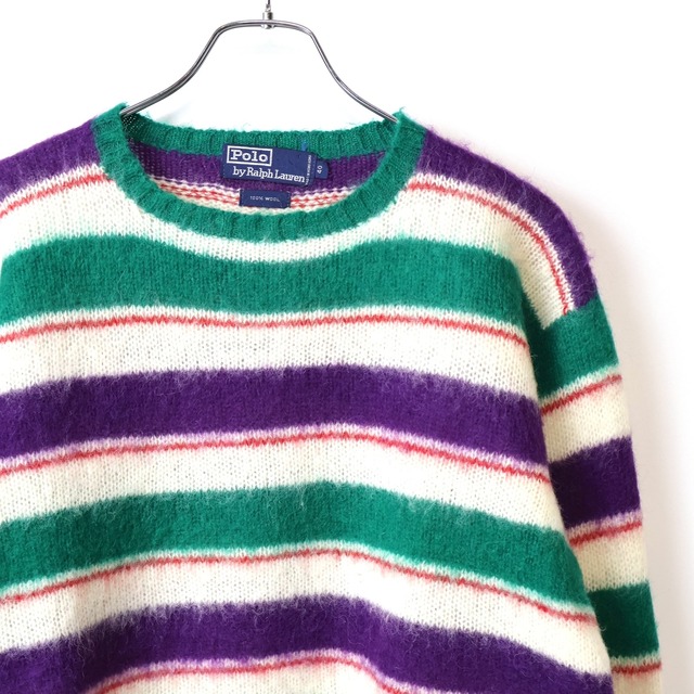 こちらは 1990年代頃の Polo by Ralph Lauren Multi Border Wool Knit です。 サイズ表記は40。 素材表記は Wool 100%。 マルチボーダーパターン。 毛足感。 状態は、特に目立つ汚れやダメージの無いグッドコンディションです。 平置き実寸 着丈 59.5cm(バック襟付け根から) 身幅 56cm(脇下) 肩幅 55.5cm 袖丈 51.5cm(脇下から袖先) 多少の誤差はご了承下さい。 あまり見かけないウール素材のマルチボーダーニット。 配色、ブランドネームも良く、ウールの毛足感が抜けておらず、非常に雰囲気のある1着です。 インナーにもニット1枚で過ごして頂ける時期にも活躍するアイテムです。