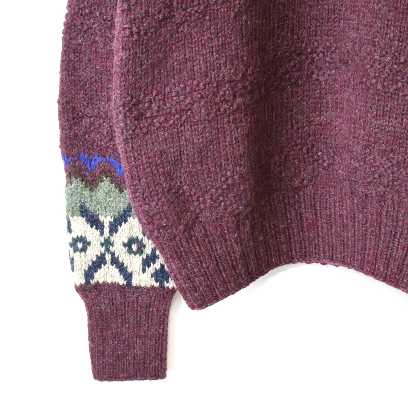 近年人気の高いノルディック柄のニットで、中でもグッドカラーかつ控えめな柄のデザインが着用のしやすさもあり、厚めな素材感でシンプルすぎずオススメなアイテムです。